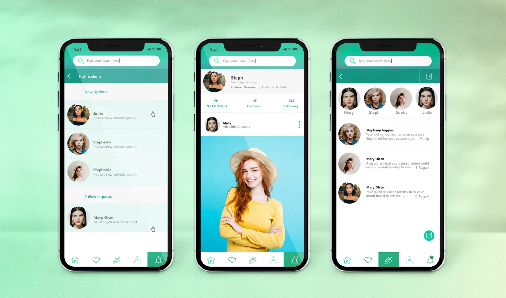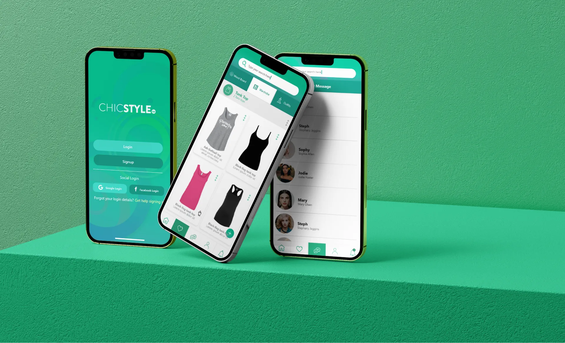 Chic Style employs a combination of SF Pro and Raleway fonts to enhance readability and aesthetic appeal. The color palette includes Chic Style Green, White, and Black shades, providing a visually cohesive and elegant interface that resonates with fashion-forward users.